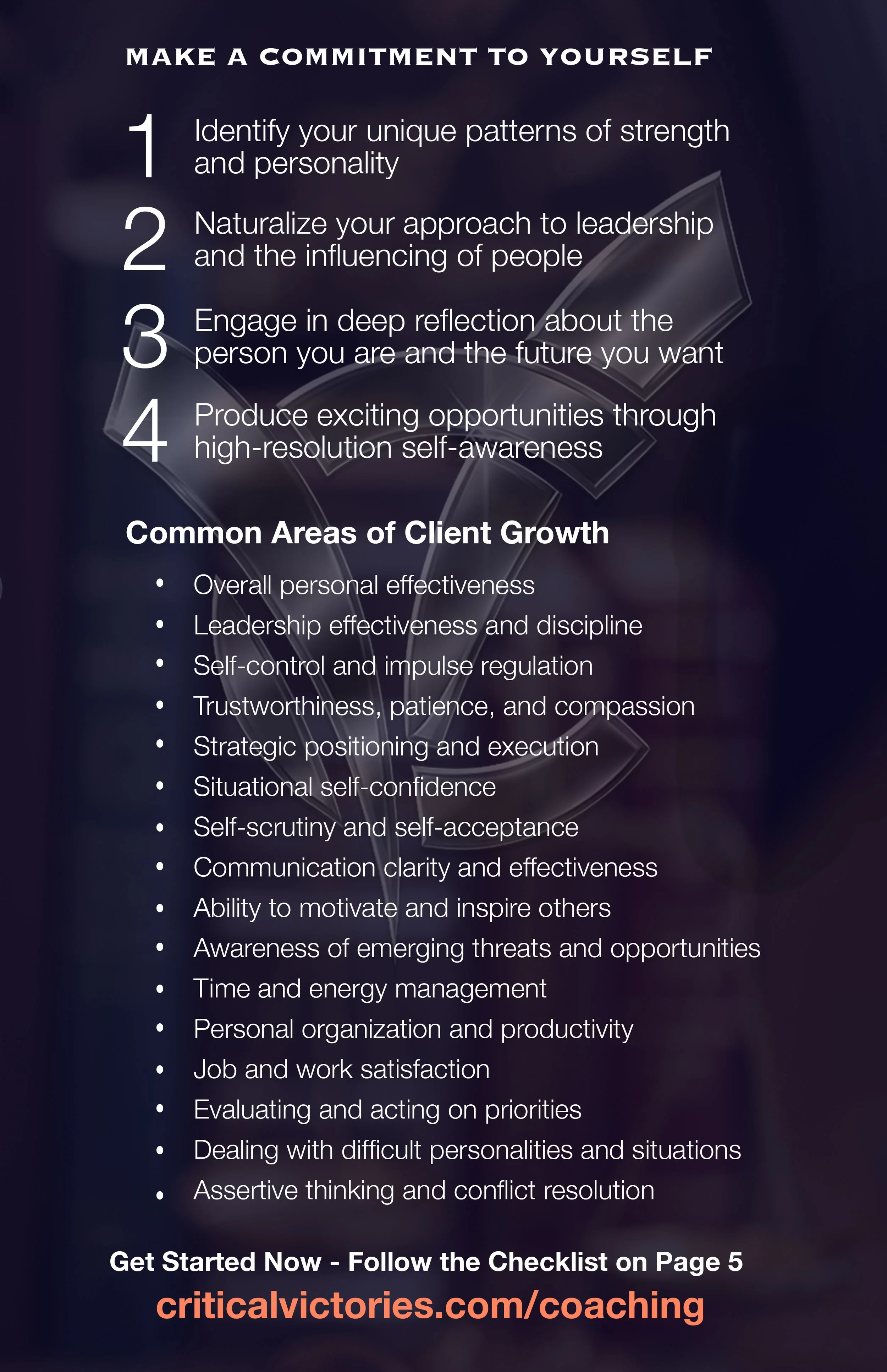 Complete a series of five introductory assignments to begin your coaching journey with no continued obligation whatsoever. Every client that enters my practice is presented with these assignments. Now is your chance to open your mind, career, and future to thought-provoking insights that will change your life.